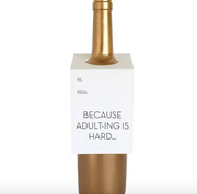 Chez Gagné's "Because adulting is hard" Wine & Spirit tags are letterpress printed on a vintage printing press.