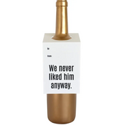Our "We Never Liked Him Anyway" Wine & Spirit tags are letterpress printed on a vintage printing press.
